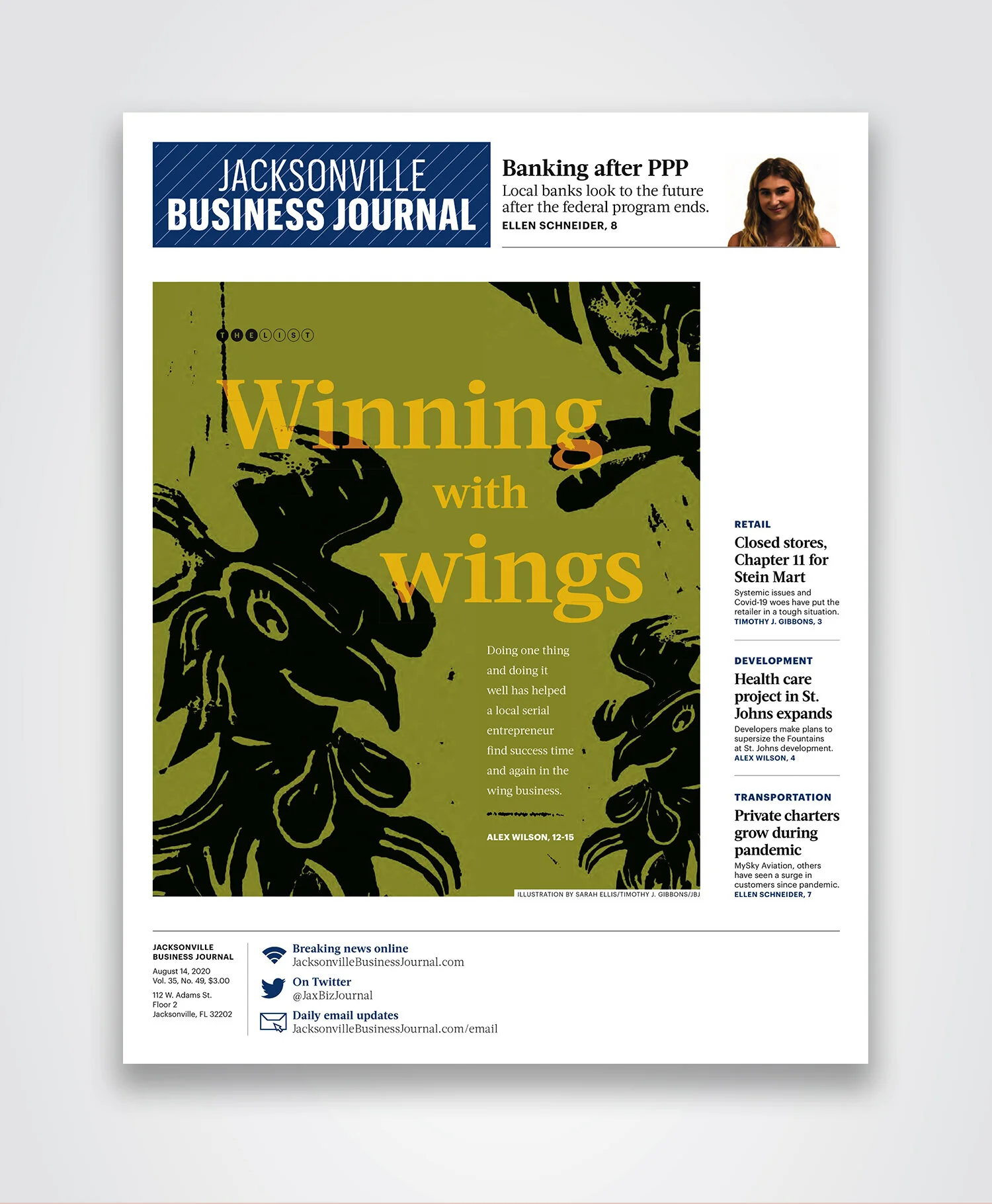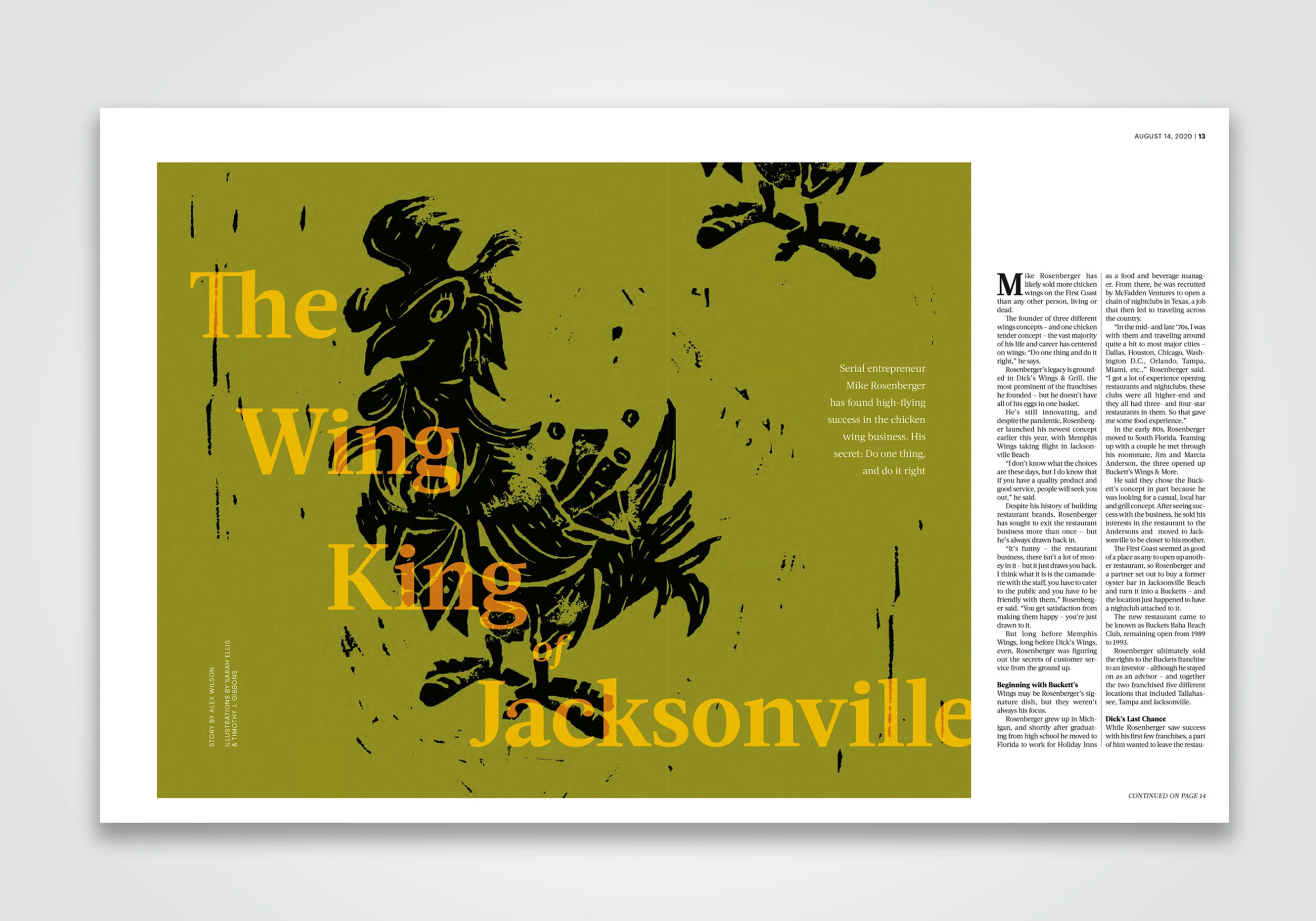 THE WING KINGA linocut chicken holding a wad of cash brings a creative angle to what would have been handout art after a photoshoot fell through. View fullsize View fullsize View fullsize